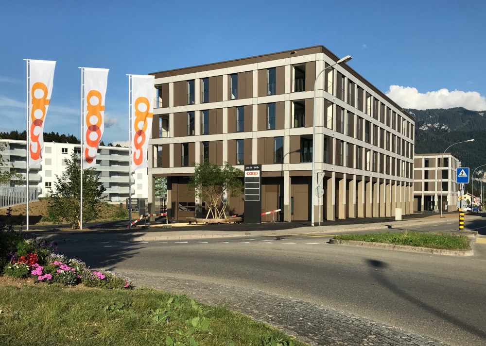 Chantier terminé. Construction de 2 immeubles d’habitation avec filiale Coop et garage sous-terrain sous la direction du bureau OCSA o charrière architectes SA à Bulle pour la CPPEF (Caisse de prévoyance du personnel de l’Etat de Fribourg).